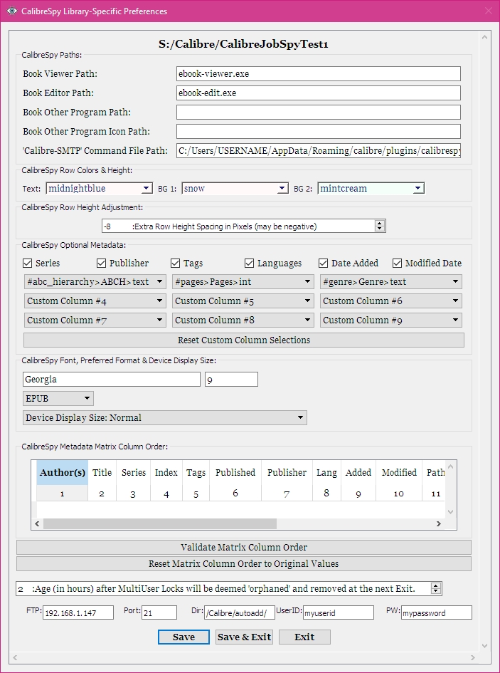Maybe I have misunderstood something fundamental, so: Can one run the GUI simultaneously with multiple command line initiated instances of CalibreSpy? I understood one couldn't, but I haven't tried. Any reason why you couldn't use the font set in Preferences->Look and Feel Added: The Tooltip for the Exit button states - Save current CalibreSpy window settings and then exit. - that does not seem to include the column width settings BR Last edited by BetterRed; 08-22-2018 at 02:31 AM. |