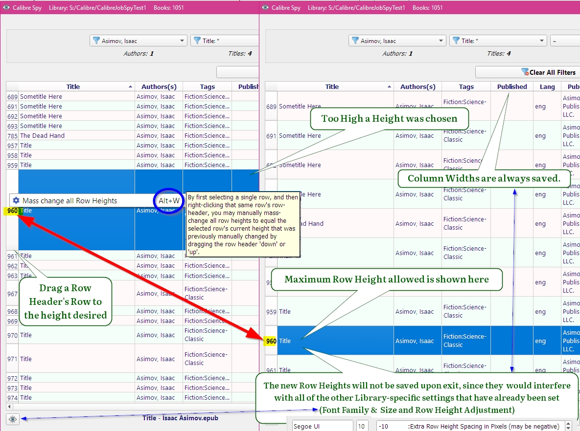 Version 1.0.8 - 31 Aug 2018 Speed of filtering and clearing of filters significantly increased. Path column now elides in the middle so the far right (end) of the book file name with its format extension are always visible. Row heights can now be manually changed with a mouse, just as for column widths. However, row heights are not saved permanently (as are column widths). Row heights can now be manually mass-changed temporarily by right-clicking the just-manually-changed row header and selecting the menu option to do so (or use the shortcut Alt+W). Filtering dropdown box selection 'count' for Series, Tags and Publisher no longer include the values of "blank/empty/nothing". See the attached image. DaltonSTShow TooltipShow Tooltip Last edited by DaltonST; 08-31-2018 at 05:03 PM. |