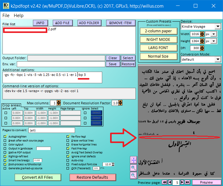 Thank you for this wonderfull program ! I have a KP3 and I try to read this arabic PDF (joined). I used different settings till I get these arguments : -as -r -om 0.12 -idpi -2 -gs -dev kp3 -gtr 0.2 -j 2+ -sm -col 1 -x I just need to know if they are the most suitable for my PDF, or from you experience it could be best with others settings ? Also I wonder how to increase the numbers of words per ligne without losing quality of the PDF ? Great Thanks in advance |