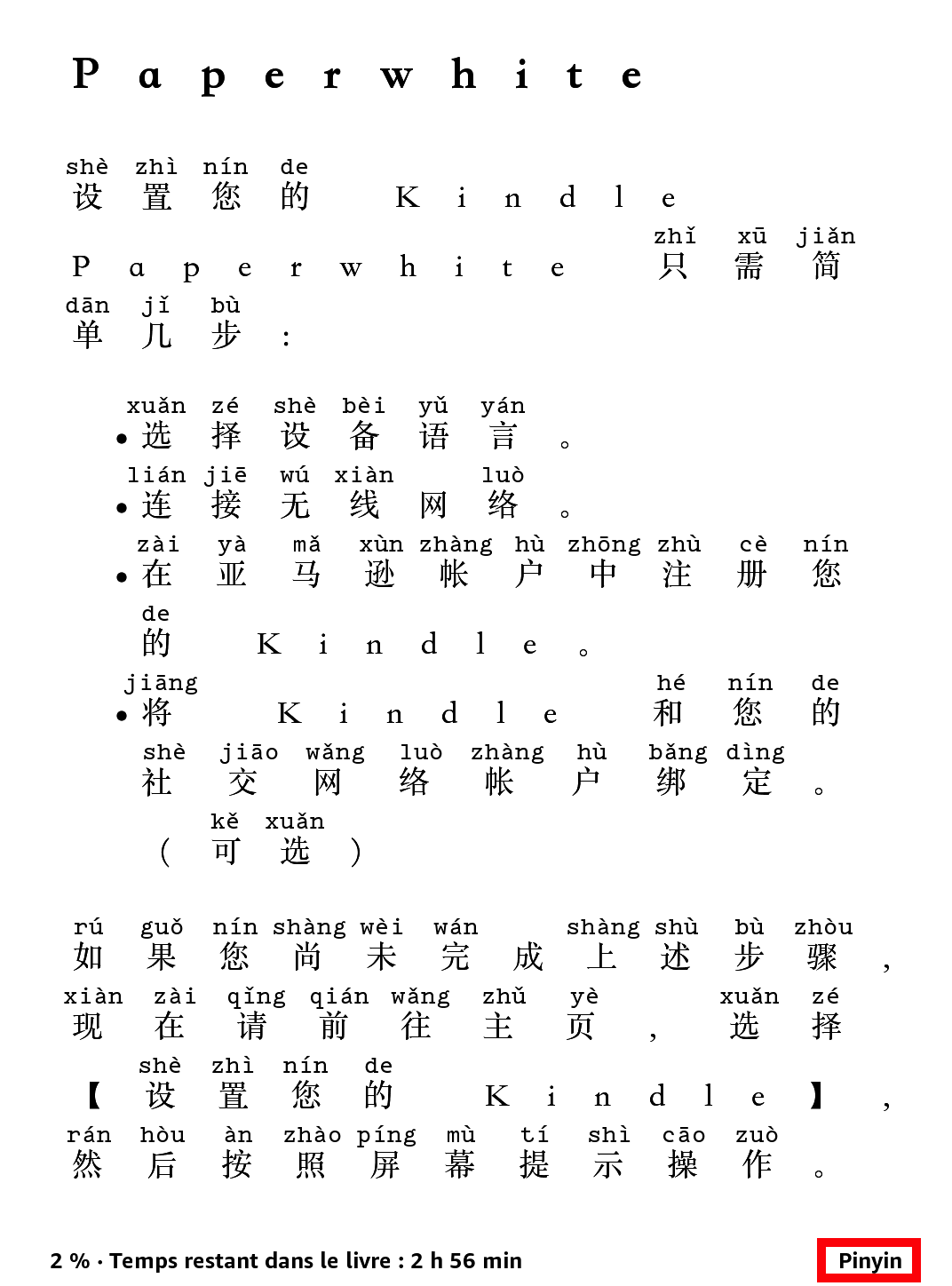 Books in chinese language (such as the Kindle User's Guide Chinese Edition in these screenshots) will (unsurprisingly) display pinyin above chinese characters: And have an active pinyin level menu: The feature doesn't seem to be implemented in a way similar to wordwise. I couldn't find an equivalent of the mnt_us/system/kll/kll.en.en.klld wordwise data base with accompanying mnt_us/bookASIN.sdr/LanguageLayer.en.ASIN.kll in the sdr directory for the book. By curiosity, has anybody researched how/where pinyin is implemented? |