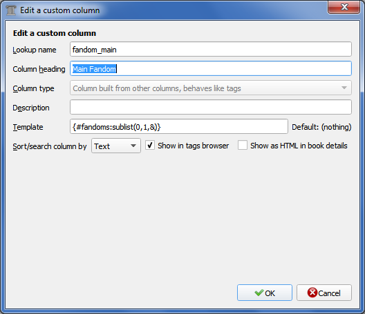 {#fandom_main} - {#fandom_secondary}/{author}/{title} ({#story_id}) change to: {#fandom_main:sublist(0,2,\,)} - {#fandom_secondary:sublist(0,2,\,)}/{author}/{title} ({#story_id}) In case your column definition is like tags. If not, you need to check if your list separator is a comma or something else and correct the separator to what ever you are using. The result should be something like fandom_main1,fandom_main2 - fandom_secondary,fandom_secondary\author\title (story_id) It takes from each of your two fandom columns list the first two items. |