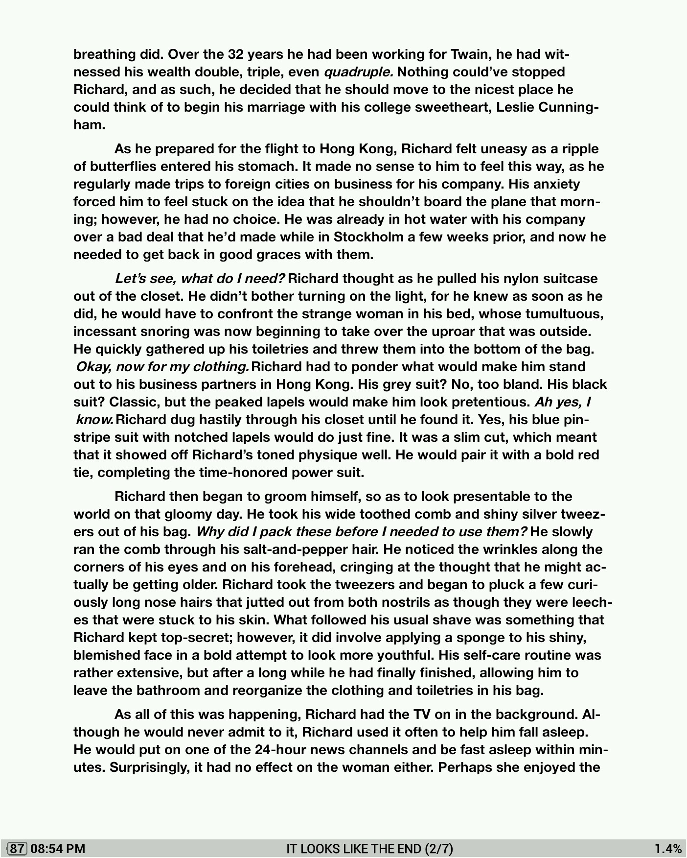 & the page count by chapter adding up to t total pages per book would go haywire if there was not a 1:1 match between chapters and html files. having mutilple chapters in a single file or having a chapter split over muitiple html did upset it, so I would manually fix that with calibre or sigil before reading