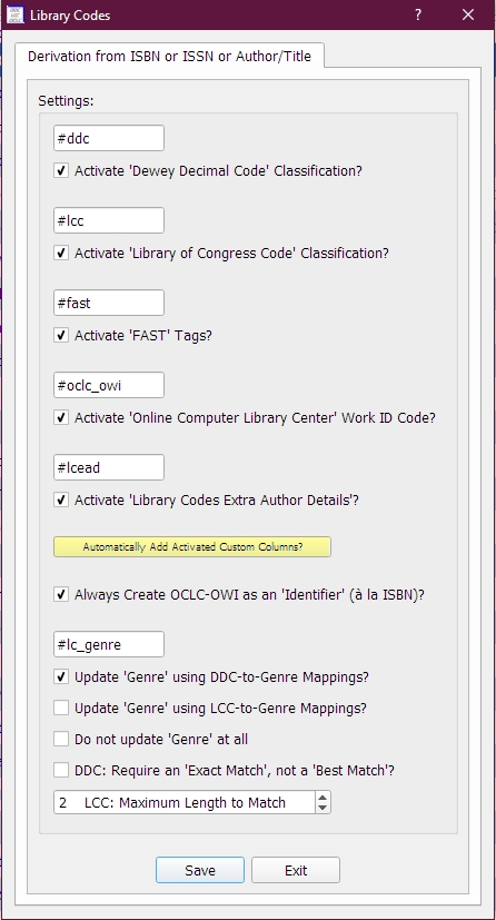 [2] The LC Genre submenu has a menu item to specifically import a .csv file to add/change the mappings. The original .csv file is attached to the Original Post. See https://www.mobileread.com/forums/sh...11344#poststop for a user-submitted French version. [3] LC code downloads have no time-based execution limits other than the elapsed time it takes to actually execute the web queries. To avoid burdening the various web servers, LC paces itself. DaltonST |