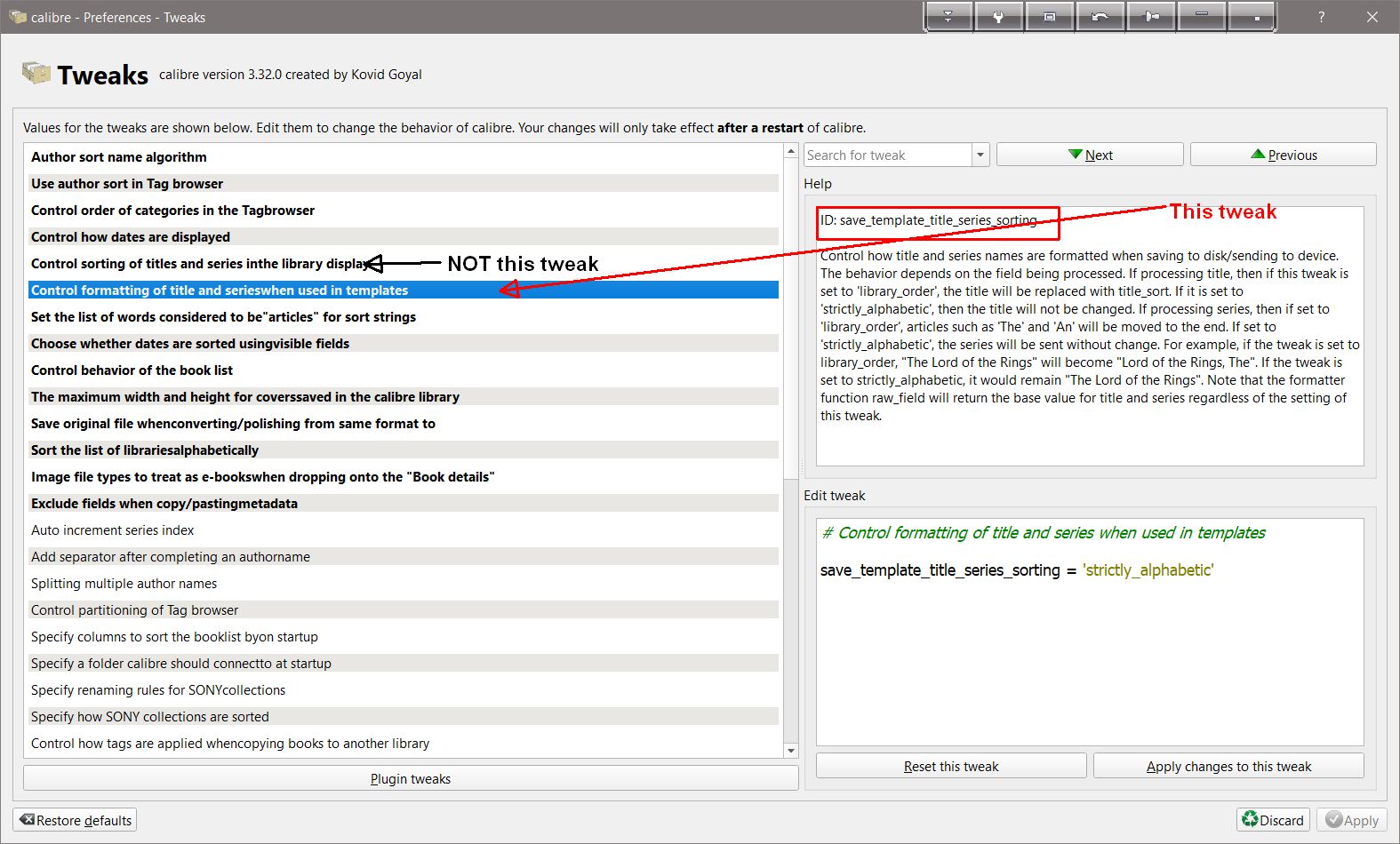 # Control formatting of title and series when used in templates save_template_title_series_sorting = 'strictly_alphabetic' Edit: BR already posted this... Make sure you are changing save_template_title_series_sorting Last edited by JimmyR; 10-12-2018 at 07:30 AM. Reason: Add Info |