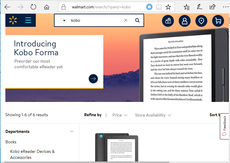 If it helps, when I go to Walmart and search for 'kobo' it lists the Aura 2 and the H2O2, but the top third of the screen is a banner ad for the Forma.