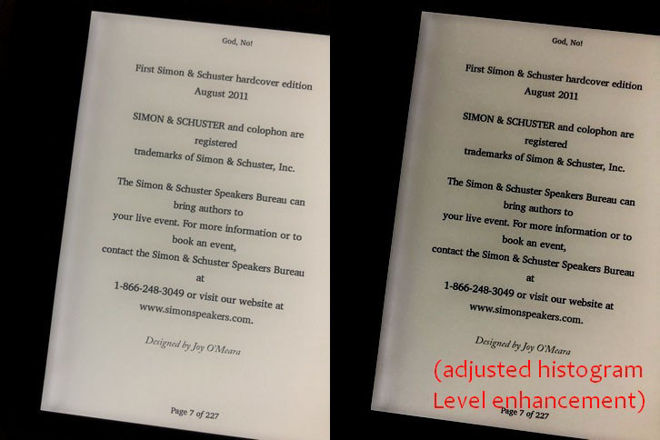 All the image with the device brigthness at 100% Kobo Forma https://ibb.co/k8RxRV Kindle Voyage https://ibb.co/ky1xRV Kobo H2O 2014 https://ibb.co/iSNbLq |