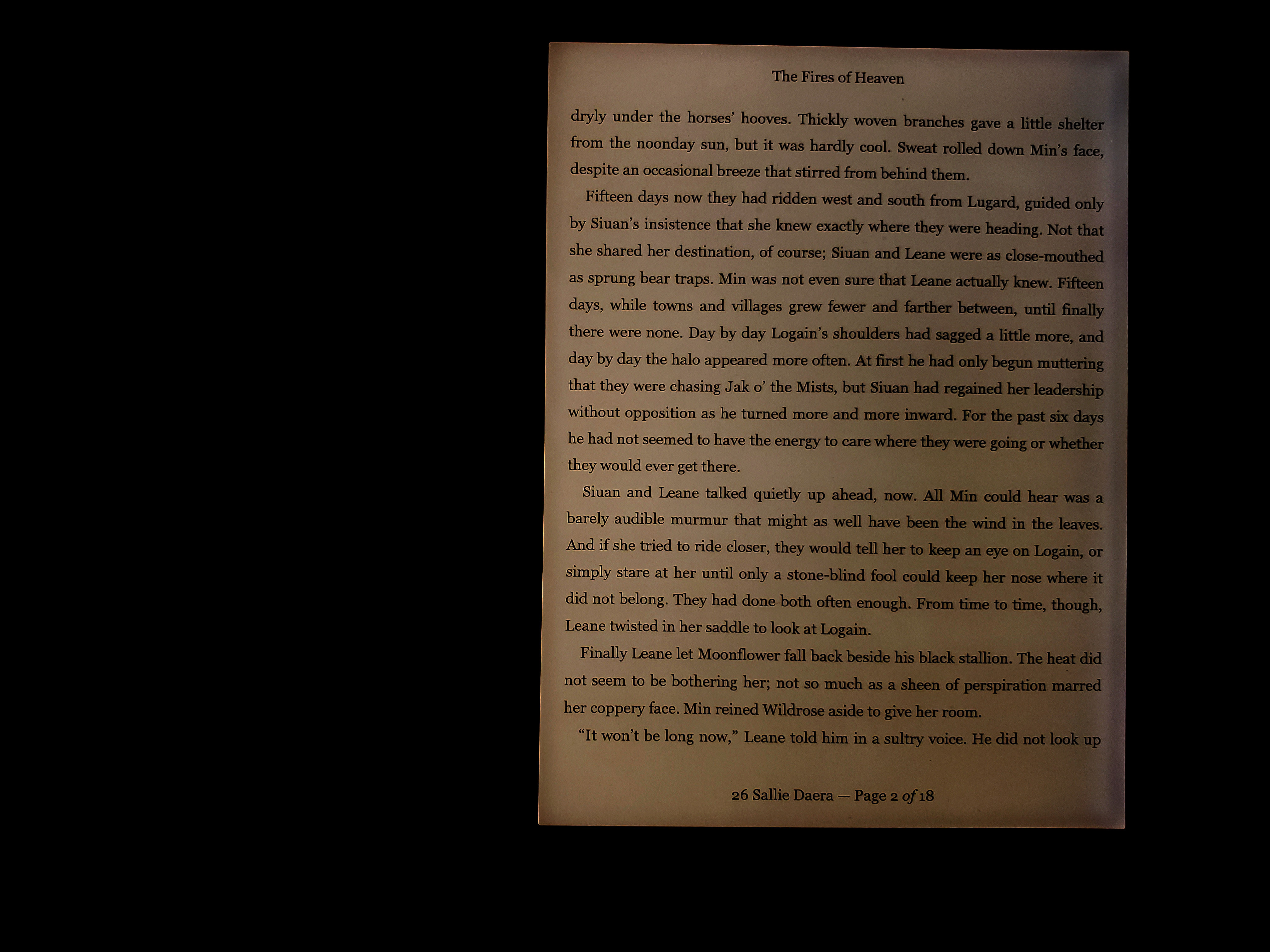 I was more so talking about people that literally only said left side or right side with nothing to indicate how they were holding the Forma. I know I alternate, if I’m sitting I hold it in my left hand when I’m laying down I hold it in my right hand. I haven’t noticed a streak either way. It’s possible it’s there and it just doesn’t bother me so I don’t notice it, or that it’s not there. In either case I’m more inclined not to look for a fault. I use the patches to get the margins as thin as possible without having the text run right on the bezel. The left and right margins are quite thin, with the top and bottom margins close enough that I cannot get another line of text in either of them. This is with a fairly small font size comparable to a mass market book with smaller line spacing. |