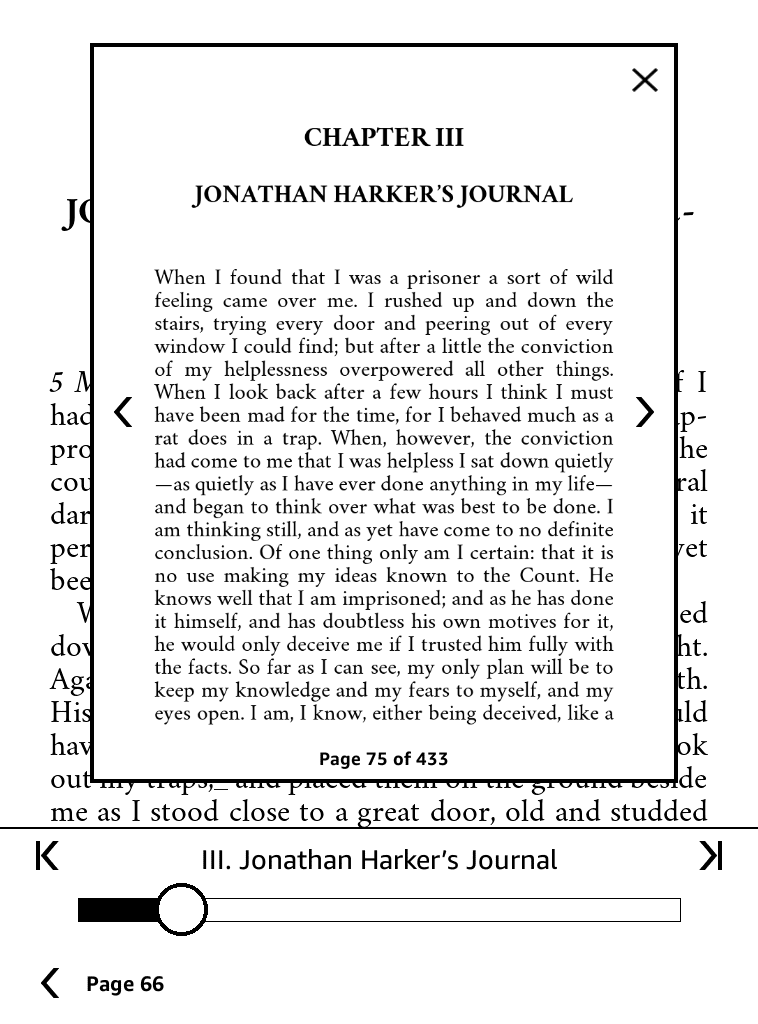 That makes it technically one more interaction away, but it doesn't clash with anything, and you also get a chapter skip pane at the bottom (like the Kobo's <-> menu), with a draggable thumb along the progress bar, and an easy way to get back to your current position, since you technically never leave it until you've confirmed your target page (by tapping basically anywhere that's not already a button on the preview popup) .I don't *think* there's anything else of the sort available straight from a book page, but it's been a while, so, eh, take this with a grain of salt .