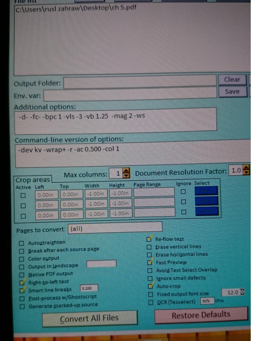 I'm using k2pdfopt in terminal, on Arch Linux and I have Tesseract setup correctly. Here are my arguments: Code:
