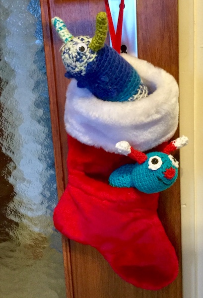 Weihnachten naht mit großen Schritten, und ich habe endlich die Raupe für den kleinen Sohn eines Kollegen fertiggestellt. Diesmal hat sie sogar Füße und geht daher wohl nicht als Bücherwurm durch.