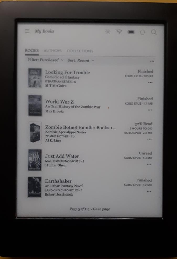 One problem I would love to fix is the inability to increase the font size on both the library and collection screen. Somebody mentioned this was possible with a Kobo. I would love a photo of how this would look on a kobo, please. I use a details view, as I find cover views difficult for me. Below is the size font I read with, collections and library view. If anybody has a better suggestion than the Kobo Aura H2O 6.8" eReader (2nd Generation) or a heads up of something better due out, I would love to hear. ![]() Last edited by applesauce; 11-19-2018 at 11:07 PM. Reason: add photos |