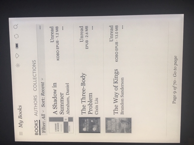 One problem I would love to fix is the inability to increase the font size on both the library and collection screen. Somebody mentioned this was possible with a Kobo. I would love a photo of how this would look on a kobo, please. I use a details view, as I find cover views difficult for me. Below is the size font I read with, collections and library view. If anybody has a better suggestion than the Kobo Aura H2O 6.8" eReader (2nd Generation) or a heads up of something better due out, I would love to hear. ![]() Last edited by applesauce; 11-19-2018 at 10:07 PM. Reason: add photos |