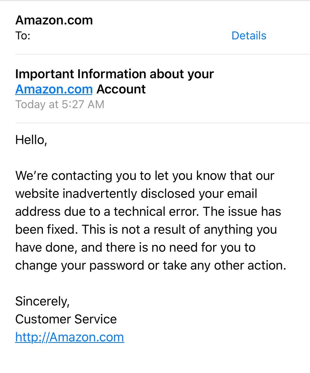 Has anyone received an email from Amazon telling you that your name and email address was exposed? The email looks suspicious to me. It says no need to change your password and the bottom has a link to Amazon without https and Amazon is capitalized in the link. I didn't get one.