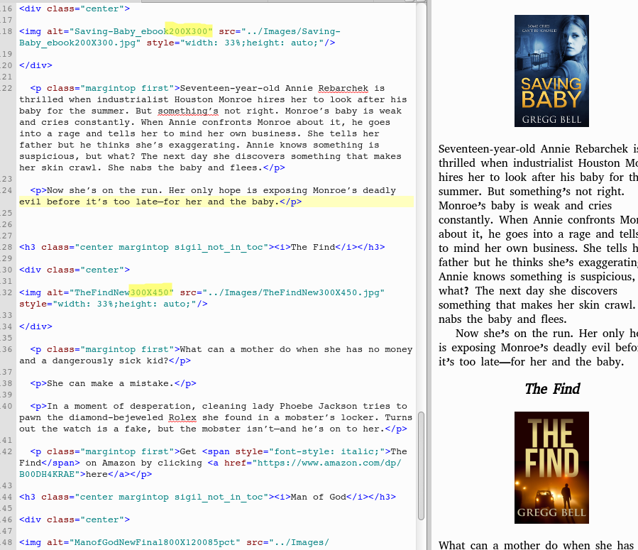 OOPS-A-NAVY (...15): <img alt="OopsANavy200X300" height="300" src="../Images/OopsANavy200X300.jpg" width="200"/> DUPES-A-NAVY (...51): <img alt="DupesANavyFinal200X300" src="../Images/DupesANavyFinal200X300.jpg" style="width: 33%;height: auto;"/> RISE OF THE ANIMAL RESCUE FEMINISTS (...19) <img alt="RiseFinal300X45095pct" src="../Images/RiseFinal300X450X95pct.jpg" style="width: 33%;height: auto;"/> I LOVE YOU I KILL YOU (...48) <img alt="ILoveYouIKillYou300X450X95pct" height="300" src="../Images/ILoveYouIKillYou300X450X95pct.jpg" width="200"/> BLOODY SUNRISE (...06) <img alt="BloodySunriseFinal400X600" height="600" src="../Images/BloodySunriseFinal400X600X90pct.jpg" width="400"/> SAVING BABY (...24) <img alt="Saving-Baby_ebook400X600X90pct" src="../Images/Saving-Baby_ebook400X600X90pct.jpg" style="width: 33%;height: auto;"/> THE FIND (...41) <img alt="TheFindNew300X450" src="../Images/TheFindNew300X450X95pct.jpg" style="width: 50%;height: auto;"/> MAN OF GOD (...02) <img alt="ManOfGodNewFinal250X375" src="../Images/ManOfGodNewFinal250X375.jpg" style="width: 33%;height: auto;"/> Some are conventional HTML, some are yours. To my eye BLOODY SUNRISE and THE FIND look best. Do you have an opinion? I would think your HTML (as in THE FIND) would provide more flexibility with all the different devices out there. |