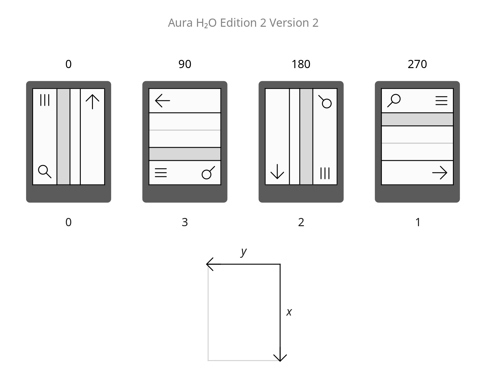I've attached an example of visual representation that could be used to communicate the required information. The row of numbers under the devices indicates the read values when the written values are 0 1 2 3. On the Aura H₂O, for example, this row would be 2 3 0 1. The axes of the touch coordinates are given at the end. |