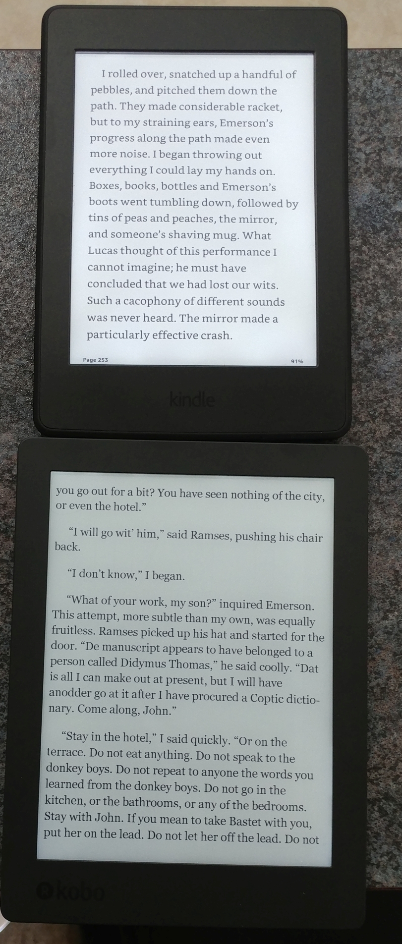 Yeah, I clearly prefer a lot of things about the Aura, but I've been noticing that I pick up the Nook more often. Side by side, I really don't see a glaringly obvious difference, but having spent time reading on both, the sharper fonts and slightly higher contrast on the Nook's Carta screen are noticeable.