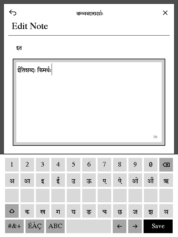 Step one: Since we need a lot of characters, we set the local language of the OS to Russian so that we can make use also of the Cyrillic keyboard in addition to the English keyboard. A disadvantage of this is that informations that are provided directly by the OS are displayed in Russian. But these cases are not too many. Step two: We have to assign Devanagari letters to the keys. This involves overwriting parts of the binary file libnickel.so.1.0.0. There are several tools to do this. I used the patcher of "Modifications for bad eyes". One of the problems is that some characters/parts of characters are not shown on the keyboard, namely non-initial vowels, anusvara, anunasika, and virama. My solution for this is to assign these signs to positions on the keyboard that can easily be remembered. I assigned the virama to the key under the key of the initial "a", the non-initial vowels under the keys of the corresponding initial vowels (that means non-initial "long a" under initial "long a" and so on). I assigned the anunasika to the key left of "ma", the visarga to the key left of "ha", the virama to the key under initial "a", and also to the key left of "va". I did this for the keyboard layout used by Kobo Touch and so on. For other devices this will need adaptations, or might not work at all. On the extended keyboard there ares still some positions available for the Hindi specific characters, which I did not deal with. Last edited by tshering; 12-17-2018 at 07:21 PM. |