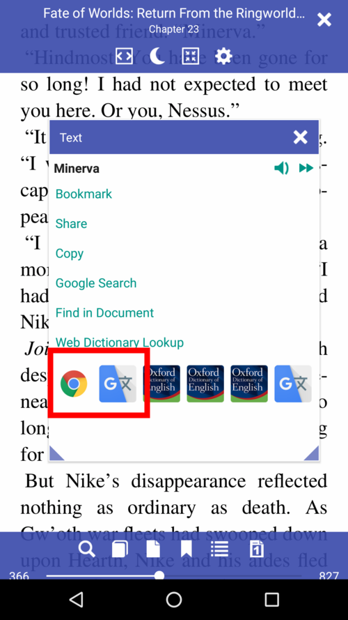Winner: This depends on whether you prefer to have quick access to more than two dictionaries, or you wish to use specialty dictionaries unsupported by Librera. For example, I can use Linguee, which can be useful for foreign languages, with Moon+Reader but not with Librera. I would say that for general use, Librera wins, and for specialty use, Moon+Reader wins.