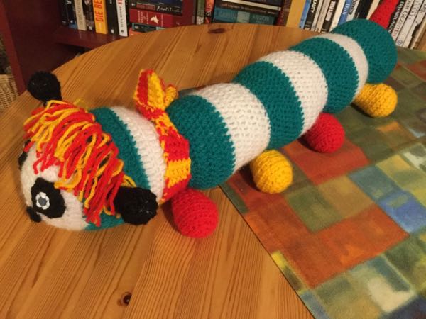 Weihnachten naht mit großen Schritten, und ich habe endlich die Raupe für den kleinen Sohn eines Kollegen fertiggestellt. Diesmal hat sie sogar Füße und geht daher wohl nicht als Bücherwurm durch.