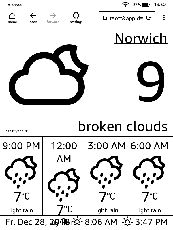 e.g. If you copy all the files into a folder on the Kindle user drive in a folder "weather", configuring config.js appropriately, then just browsing to file:///mnt/us/weather/index.html will give the display. No need for an external server. It looks like once there's a valid config.js file, even the config page works (for switching location, landscape, language, etc.) Last edited by pdurrant; 12-30-2018 at 05:11 PM. |