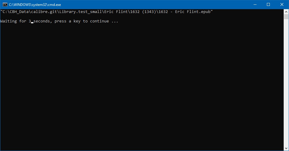 The above script works fine on my Win10 machine. When I drag a book from calibre I see the filename echoed, it counts down 5 seconds, then it closes.