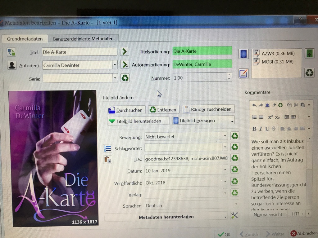 I had before all books in Mobi (because my old reader had problems with AZW3-format. I tried now with one book to transform back in AZW3 and transfer to my fire. The same. It's the book 'Die A-Karte' from Carmilla Dewinter. Then I thought, I download it again new from amazon, so I have the original file. But that's also a mobi-file in the origin. So the same. It's under 'A' instead of 'D'. Sorting for metadata are all under 'strictly alphabetical' At settings: ID: title_series_sorting # Titel- und Seriensortierung in Bibliotheksansicht festlegen title_series_sorting = 'strictly_alphabetic' ID: save_template_title_series_sorting # Titel- und Serienformatierung bei Benutzung in Vorlagen festlegen save_template_title_series_sorting = 'strictly_alphabetic' ID: per_language_title_sort_articles # Liste der Wörter festlegen, die als Artikel aufgefasst werden per_language_title_sort_articles = {'deu': ('Der\\s+', 'Die\\s+', 'Das\\s+', 'Den\\s+', 'Ein\\s+', 'Eine\\s+', 'Einen\\s+', 'Dem\\s+', 'Des\\s+', 'Einem\\s+', 'Eines\\s+'), 'eng': ('A\\s+', 'The\\s+', 'An\\s+')} ID: locale_for_sorting # Beim Sortieren zu verwendende Sprache locale_for_sorting = '' My calibre is running in German language. So I think, I have somewhere a mistake in it. But I don't know, where. All books on my fire are in mobi. |