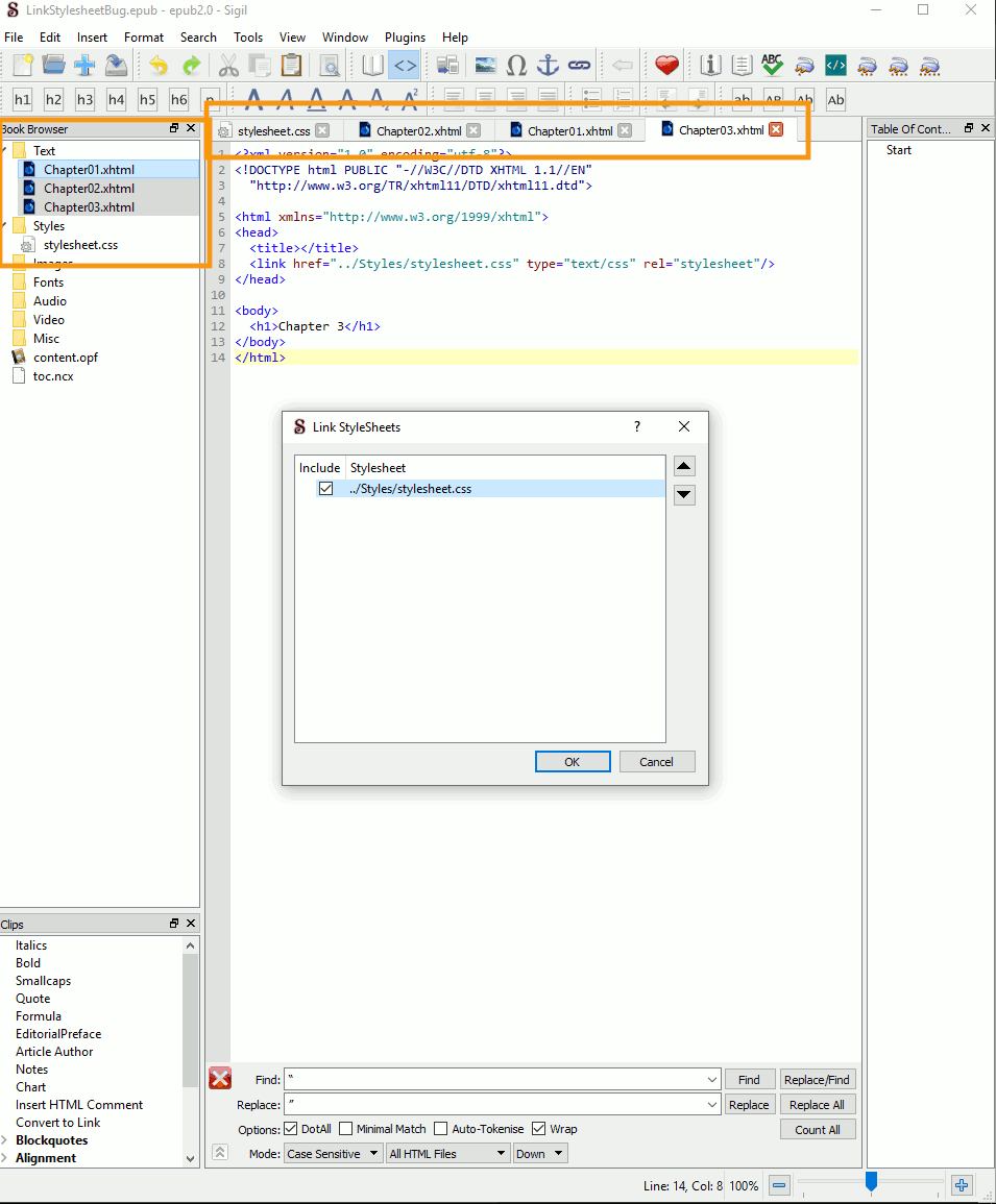 Step 3: In the Book Browser, Shift-Click all HTML files + Right-Click and select Link Stylesheets: Step 4: Link the stylesheet and press OK. Bug: All tabs close, and only Chapter03.xhtml is left open. If you have all 3 chapters + stylesheets.css open, the CSS tab also survives. So this bug seems to only close all non-active HTML files. Repeat Steps 1-4, but make sure stylesheets.css is open as your active tab. That'll be the only tab that survives. Expected Results No tabs close. |