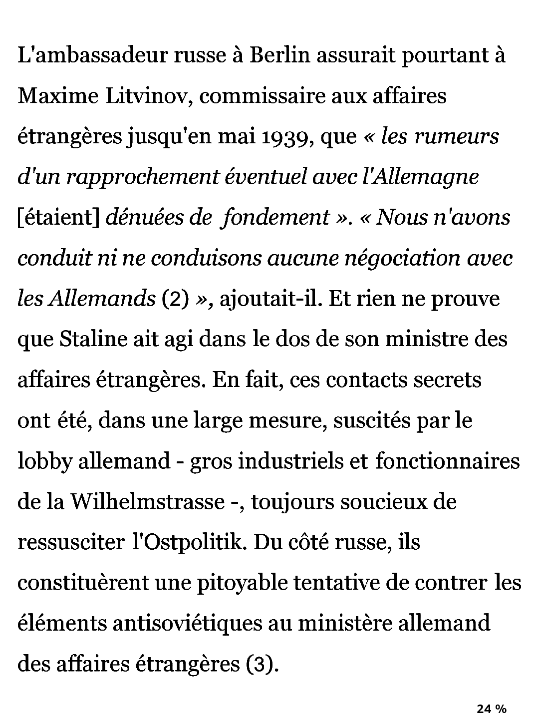 I compiled the latest version of k2pdfopt (v2.51a) after your message. My precedent results have been obtained with v2.42. Since I am using the mac version of k2pdfopt I need to ask what is the equivalent of "Fixed output font size" box in the command line ? Based on your suggestion, here is what I use currently : -gs -gtr 0.18 -col 1 -mag 1.65 -dr 2.75 -idpi 600 -vls 1.6 kp3 -x Maybe some commands are not necessary… My purpose is to get closer to what I have when reading an AZW3 (see attached Kindle' screenshots), and it is almost achieved. Thank you. What I try to get right now is : if it is possible : 1. Get the text adjusted (no space in the end of lines). Just like AZW3. 2. Specify the same font in the output file that I use when reading under Kindle PW3 (I am using a personalized one called CharInk). 3. Overcome the artefact encountered on page 16, line 5 (see pdf attached). Great thanks in advance for your time. |