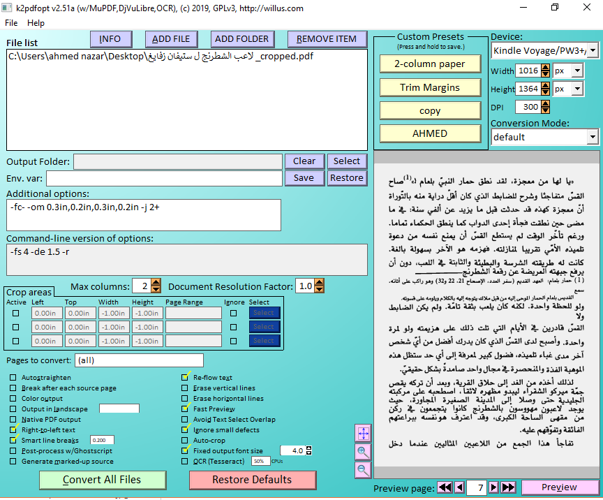 I'm using k2pdfoopt I don't know how to use it Sometime I convert the Arabic book then I lose some words or I convert and find words are bigger than the others What is the solution ? I think here I can find the developer of this software so The best help I can get it from here Best wishes 😊 |