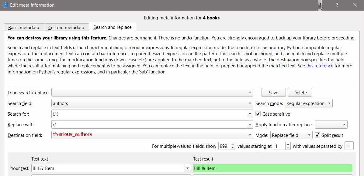 OK, I want to do a Bulk Edit/Replace on all of my anthologies to copy the list of individual authors from the authors field to my new column #various_authors. I've been trying to test it on a copy of one of the books. I tried the attached template function statement but nothing happens when I run it. Could I get some help on what it should be? First step, I made a new column to put a list of authors in for an anthology using the "Ampersand separated text, shown in the Tag browser" choice in the "Preferences -> Make your own column" dialog. It works as expected for adding names manually, copy/pasting, etc. The tag/name manager browser works. Everything looks good. Second step, I'm stuck on copying all the names to a new field (see the attached). Also what do I need to do to remove the individuals' names from authors, should I write a Template Function or can I still write it in the Metadata Search/Replace? For future, can someone clarify when and how to use a single-function template {} vs a program: 'function()' in the Edit Metadata browser. I'm not finding the documentation clear on the specific differences using the template language in the Bulk Search/Replace and the Template Function browsers. The template language is the same but the info needed in the surrounding data fields is different. Thank you for any help! Last edited by meghane_e; 01-23-2019 at 04:35 PM. |