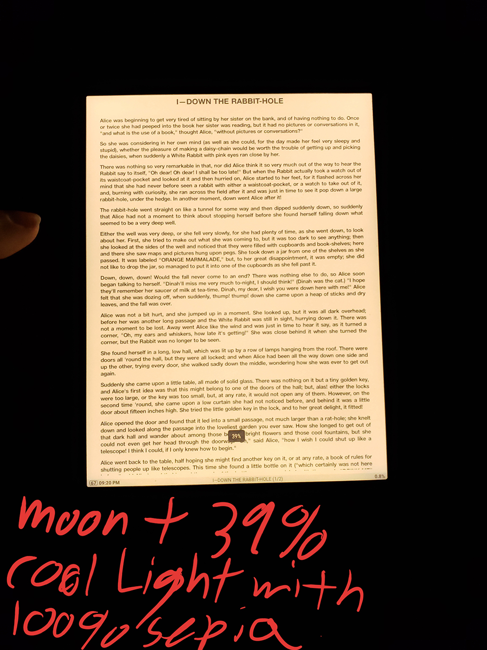 I use Moon+ Pro on all my devices to read with as I use a very specific way of re-flowing the text so it's easier on my glaucoma eyes. I imported all my settings from the T80S to the T80D and discovered a bug but also now a great feature. I have the slider on the left side of the screen for brightness adjustment turned on and it allows you to change the android display brightness. The device reports the normal cool light as the display light to the app and sepia tone leds are off a separate circuit for the device. I keep the stock ui set in sepia mode (sun) and when in moon+ the slider can be off (no light but since its not connected the ui sepia settings stay) or light on at a set level. This allows you to set the cool light with the sepia and mix them for your preferred temperature. if you go to to high on the level then it will be mostly cool and very bright as it brings the cool light to 100% while leaving the sepia at whatever level you have it at in the ui. So what I do is make my temperature then open the ui brightness menu while still in moon+ and lower or raise the brightness of the sepia in the ui to make it at the level of brightness I want while keeping the same temperature in moon+. I took some pics to better explain what it does but it is basically like a getho kobo forma.