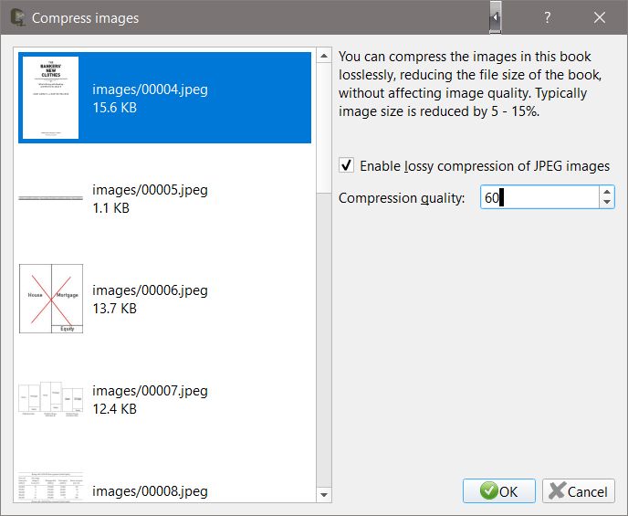 sometimes I find books large, 10-20MB but that can be reduced to a few KB because they contain images with very high resolutions while, to read an e-book, 72dpi are enough. This is the way I have found to reduce the size of all images at once, two freewere programs (FILEminimizer Picture, Bulk Rename Utility and WinRAR 5.20) are needed: 1 - open the book with the right button on the book and Edit book. 2 - select all the images and, with the right key, export all the images ... in the window that opens click on "Select folder" on the bottom right. 3 - open FILEminimizer Picture, check the box "Custom Compression" and click on "Settings", I chose 640x480 and 40%. In the upper bar click on "Settings", in Settings I have selected "Create new Optimized files, I put" _ "in the" Add this extension to file name "box and then" Insert before file name ". In Image Settings I selected "Allow editing of the format and I checked the box" Allow image resizing. 4 - open the folder where you saved the images, select all the images and drag them into Fileminimizer Picture, click on Optimize file. 5 - open Bulk Rename Utility, navigate to the folder where the reduced files are located, select them and, in the "Remove" window enter 2 in the "First n" box, then click on "Rename". The program will remove the first two characters from the names of the files. 6 - at this point return to Caliber, in the book details window on the right, right click on: "Path: Click to open" and, again with the right button on the file, click "Open with" and select WinRAR archiver. usually the images are in the folder "OEBPS" -> Images, select them and with the right key -> Delete files and confirm, always with the right button -> Add files to archive, navigate to the reduced images, select them and date Ok and confirmed. Close WinRAR, close the folder and it's done. The procedure seems long and laborious but I assure you that it is easy and fast. Please note, if there are png images in the book that File minimizer does not manage, after point 1, you need to change "png" in "jpg" throughout the book in "Search" -> Find / replace (Ctrl + F) e, after point 2, use a small program like Bulk Image Converter to change all the extensions from png to jpg. I hope this procedure can help someone. |