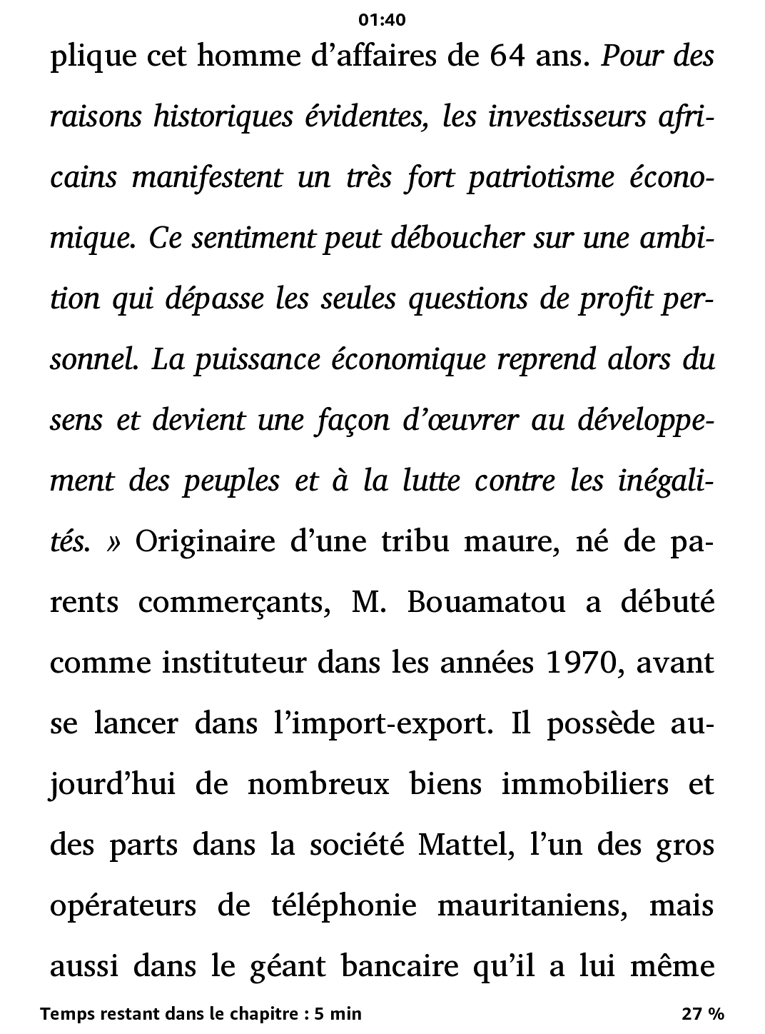 I compiled the latest version of k2pdfopt (v2.51a) after your message. My precedent results have been obtained with v2.42. Since I am using the mac version of k2pdfopt I need to ask what is the equivalent of "Fixed output font size" box in the command line ? Based on your suggestion, here is what I use currently : -gs -gtr 0.18 -col 1 -mag 1.65 -dr 2.75 -idpi 600 -vls 1.6 kp3 -x Maybe some commands are not necessary… My purpose is to get closer to what I have when reading an AZW3 (see attached Kindle' screenshots), and it is almost achieved. Thank you. What I try to get right now is : if it is possible : 1. Get the text adjusted (no space in the end of lines). Just like AZW3. 2. Specify the same font in the output file that I use when reading under Kindle PW3 (I am using a personalized one called CharInk). 3. Overcome the artefact encountered on page 16, line 5 (see pdf attached). Great thanks in advance for your time. |