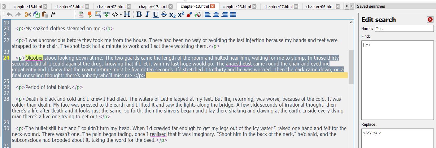 Double Clicked the word (Oktober) to select just the word, Ctrl-Shift-M to Mark it, and clicked Saved Search (Test) to [Find] Them Saved Search [Replace] Looks like the rest of the paragraph gets the <i> … </i> and not just the one word I was looking for Interestingly, it seems like the Marked area was extended to the rest of the paragraph also |