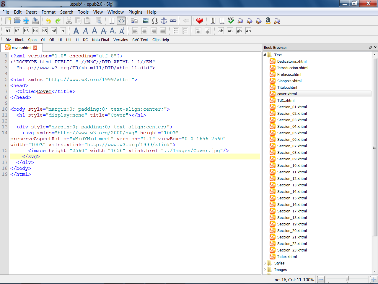 I.e., the Book Browser display doesn't match the actual spine. Also the spine reference of the item that was moved to the first position (<itemref idref="toc"/>) was deleted. The cover image spine entry (<itemref idref="my-html-cover" linear="yes"/>) was also deleted. content.opf contained the following guide section: Code: