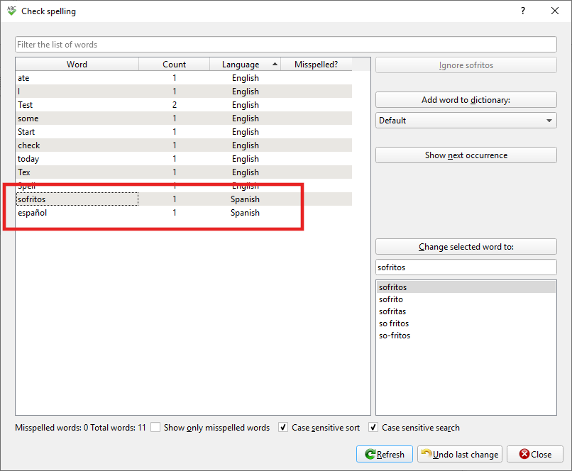 Most foreign words should pop up as misspelled. "sofritos" would stick out like a sore thumb.
