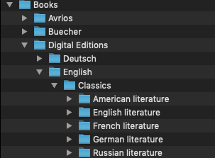 Please have a look at the screenshot - "Book" is actually the root folder, that is currently selected. I think that one should always stay on the left side and on the right only the direct siblings should be shown. It could look like "Books -> Digital Editions -> English: American literature English literature French literature ..." Also it would be nice if the book view below could be configured to only show the books directly in the current folder. A more classic view option, so to say. |