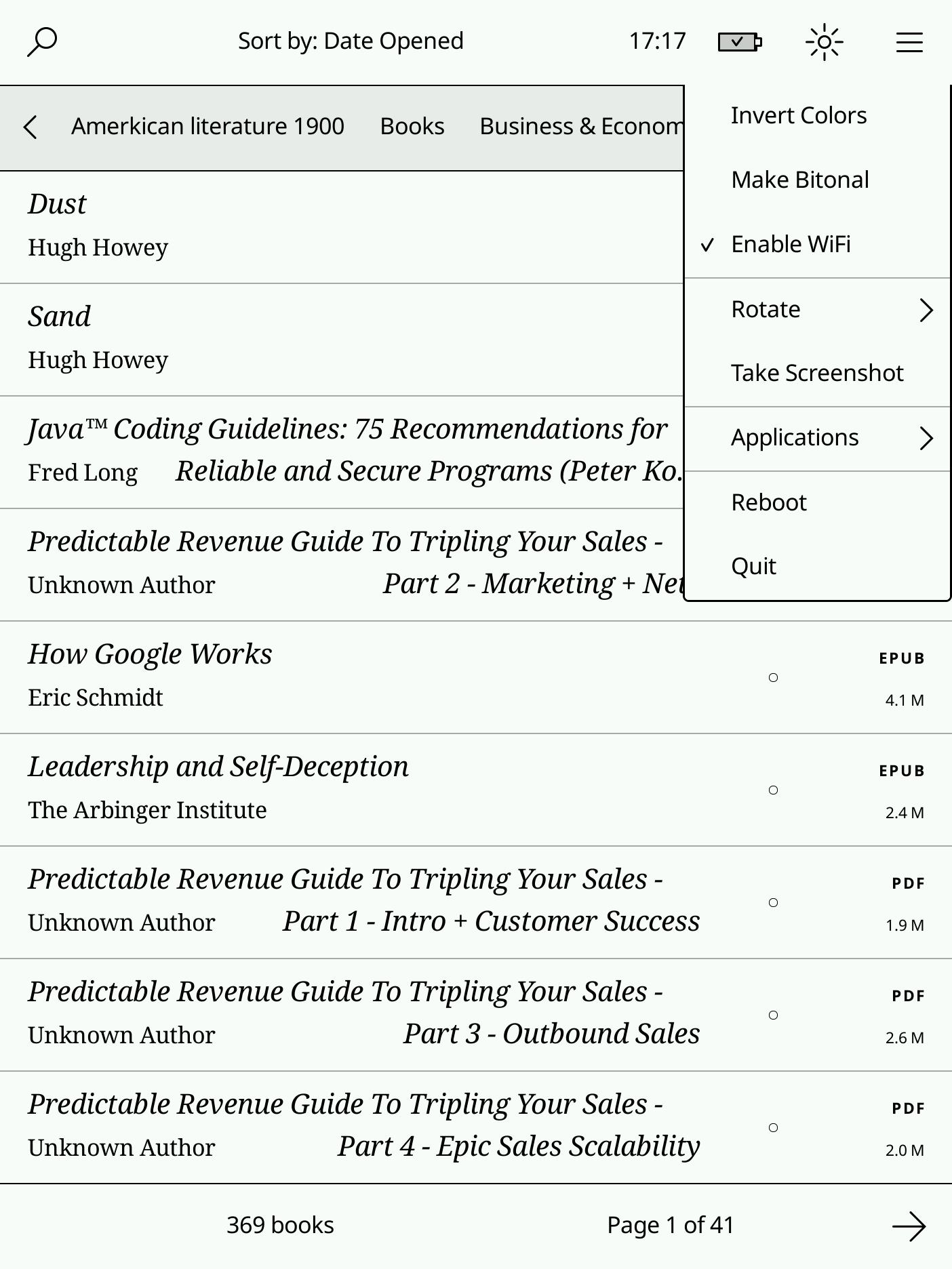 1. I tend to read one book until it is done, so I rarely go back to the menu. However it seems like the only time it saves the location back to the db is when you go there. So if it crashes or loses power it will not go back to where I left off. 2. Could there be a setting to allow it to automatically sleep after a timeout? 3. This one is more difficult, but is it possible to have a counter to see roughly how many pages are left at the current page setting? This is the one real feature that I am missing from Koreader. It wasn't always correct, but it was nice to have an idea of how many more pages are left. Thanks for all your work on this.  |