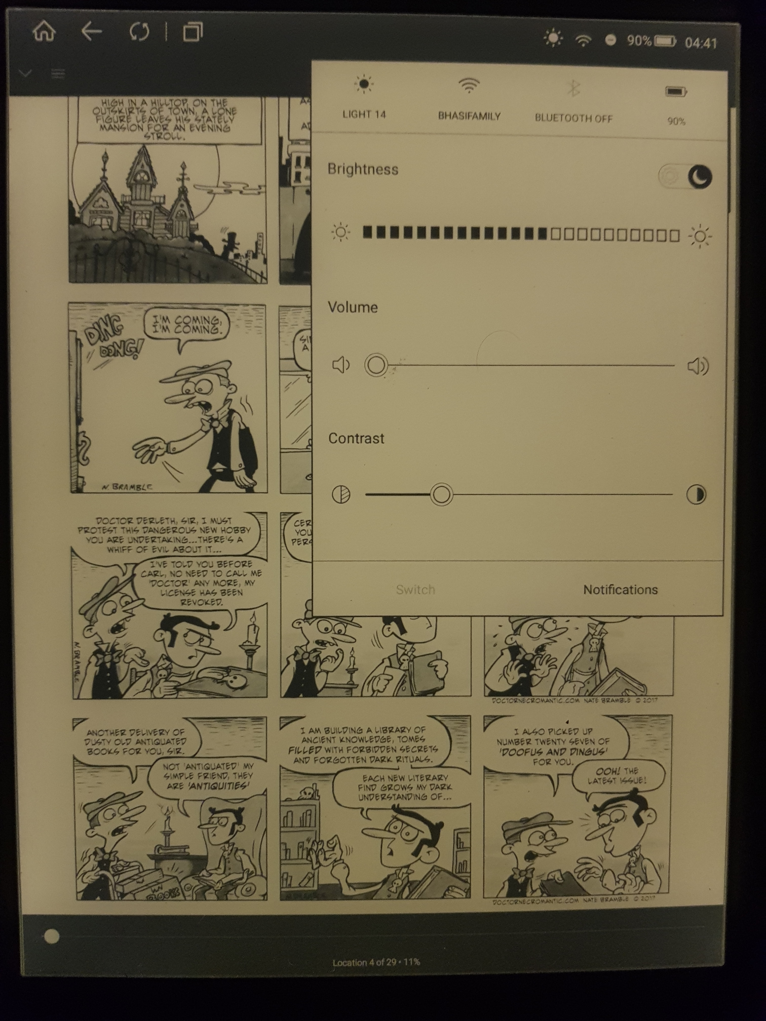 I use Moon+ Pro on all my devices to read with as I use a very specific way of re-flowing the text so it's easier on my glaucoma eyes. I imported all my settings from the T80S to the T80D and discovered a bug but also now a great feature. I have the slider on the left side of the screen for brightness adjustment turned on and it allows you to change the android display brightness. The device reports the normal cool light as the display light to the app and sepia tone leds are off a separate circuit for the device. I keep the stock ui set in sepia mode (sun) and when in moon+ the slider can be off (no light but since its not connected the ui sepia settings stay) or light on at a set level. This allows you to set the cool light with the sepia and mix them for your preferred temperature. if you go to to high on the level then it will be mostly cool and very bright as it brings the cool light to 100% while leaving the sepia at whatever level you have it at in the ui. So what I do is make my temperature then open the ui brightness menu while still in moon+ and lower or raise the brightness of the sepia in the ui to make it at the level of brightness I want while keeping the same temperature in moon+. I took some pics to better explain what it does but it is basically like a getho kobo forma.