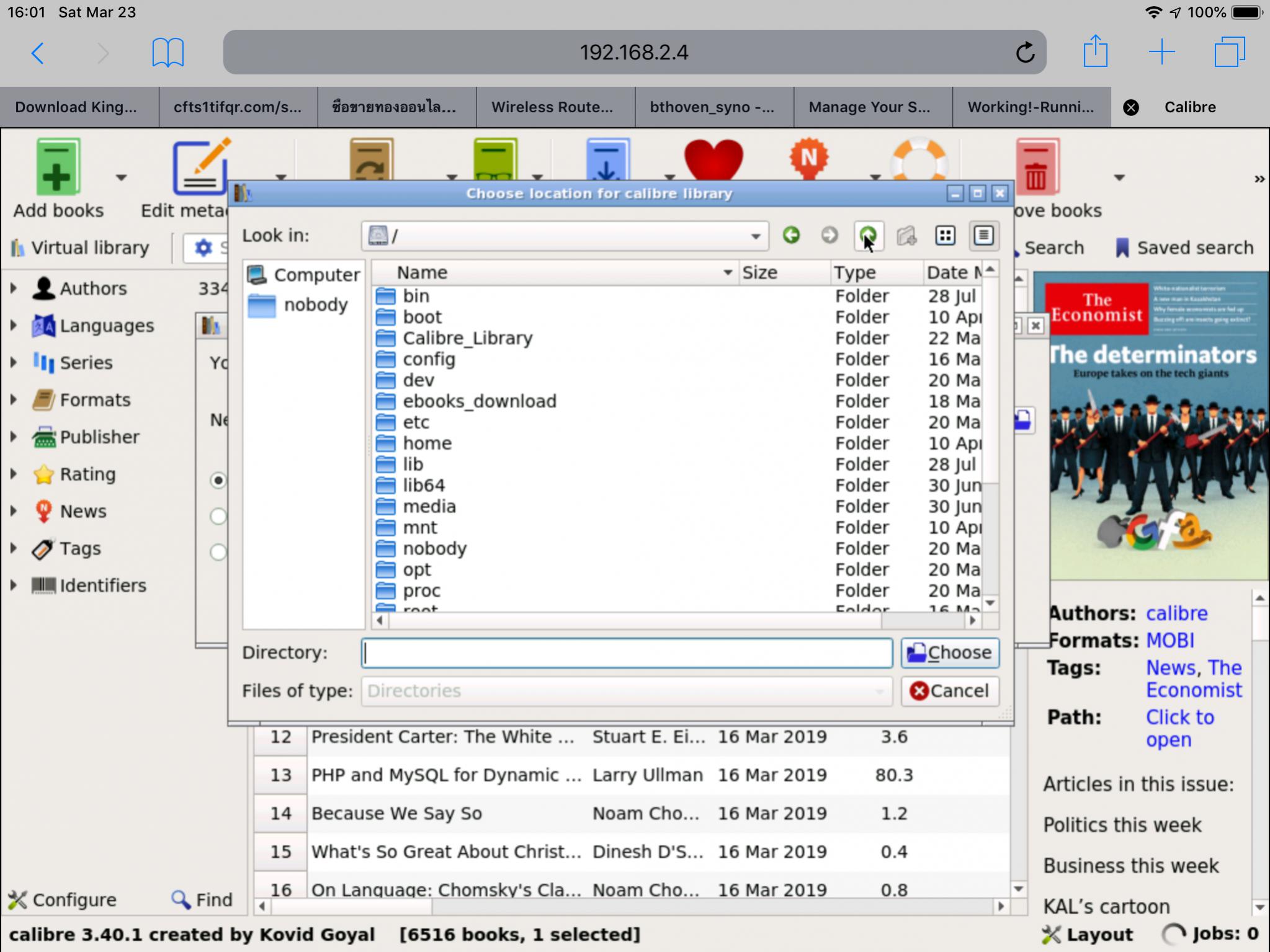 I choose it, but I can't find it on my server to add books! I set it as /Library/Ebooks. If I go to that folder, there is nothing there. There should at least be the quick start guide calibre starts with. If I drag an epub to my /Library/Ebooks, I should be able to add it through the calibre gui. When I select add books, it shows the folder is empty except that quick start guide.