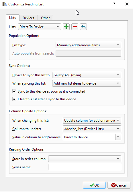 For me, I use the reading lists as a way to collect books to be added to the devices. I have the last two turned on and the first set to "Add/Overwrite all list items on the device". And I have a list for each device. That way, when I get a new book, I decide which devices it goes to and add the book to those lists. When I connect the device, the books automatically go there and the list is cleared.