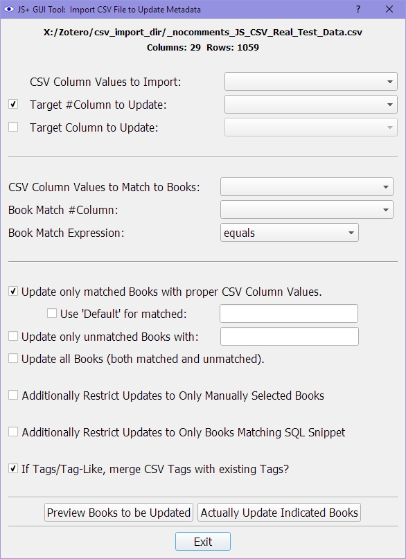Version 1.0.147 - 2019-03-09 Changes to "Import CSV File to Update Metadata": Add new option to additionally specify that only currently selected matching books should be updated.