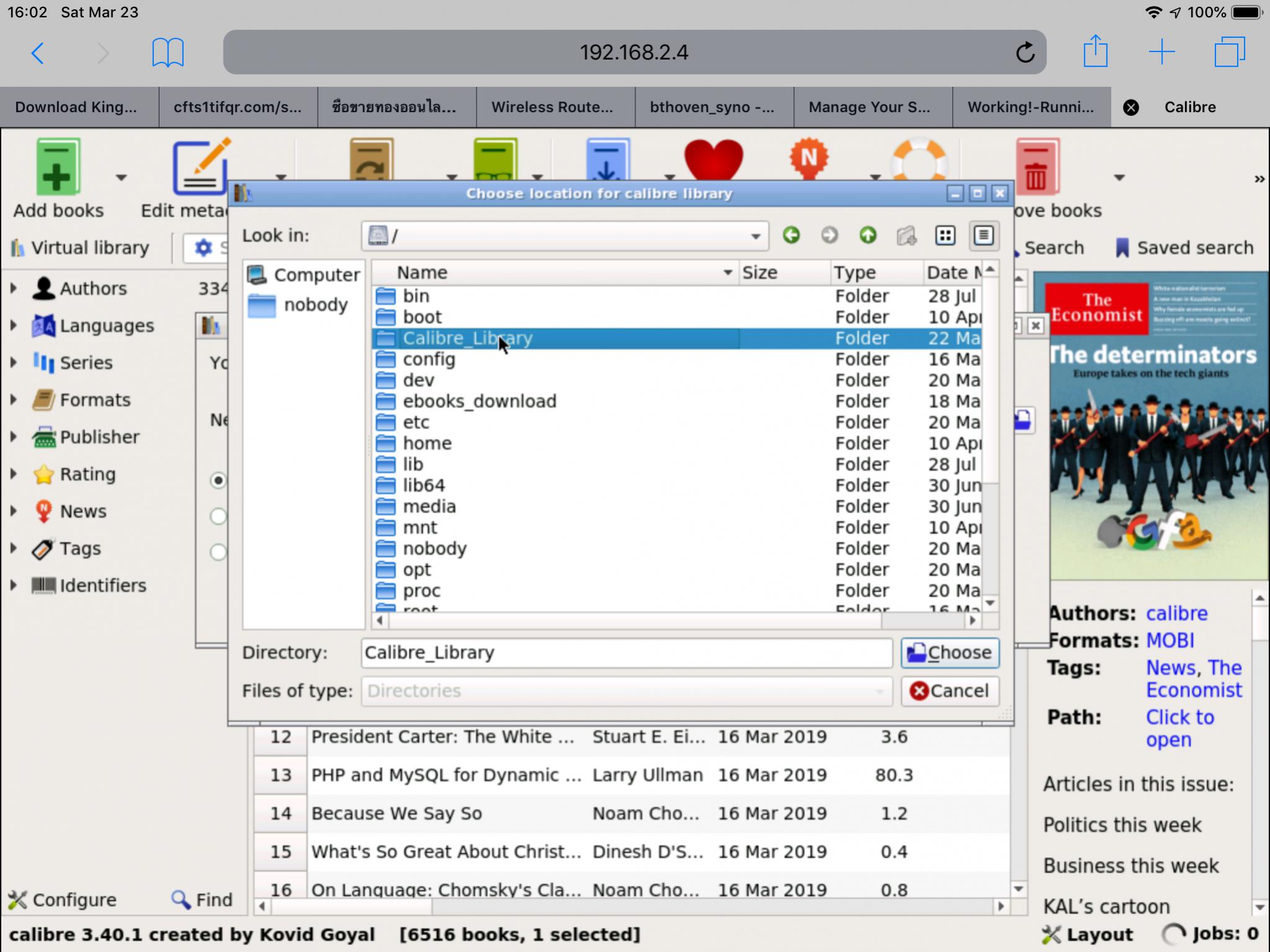 I choose it, but I can't find it on my server to add books! I set it as /Library/Ebooks. If I go to that folder, there is nothing there. There should at least be the quick start guide calibre starts with. If I drag an epub to my /Library/Ebooks, I should be able to add it through the calibre gui. When I select add books, it shows the folder is empty except that quick start guide.
