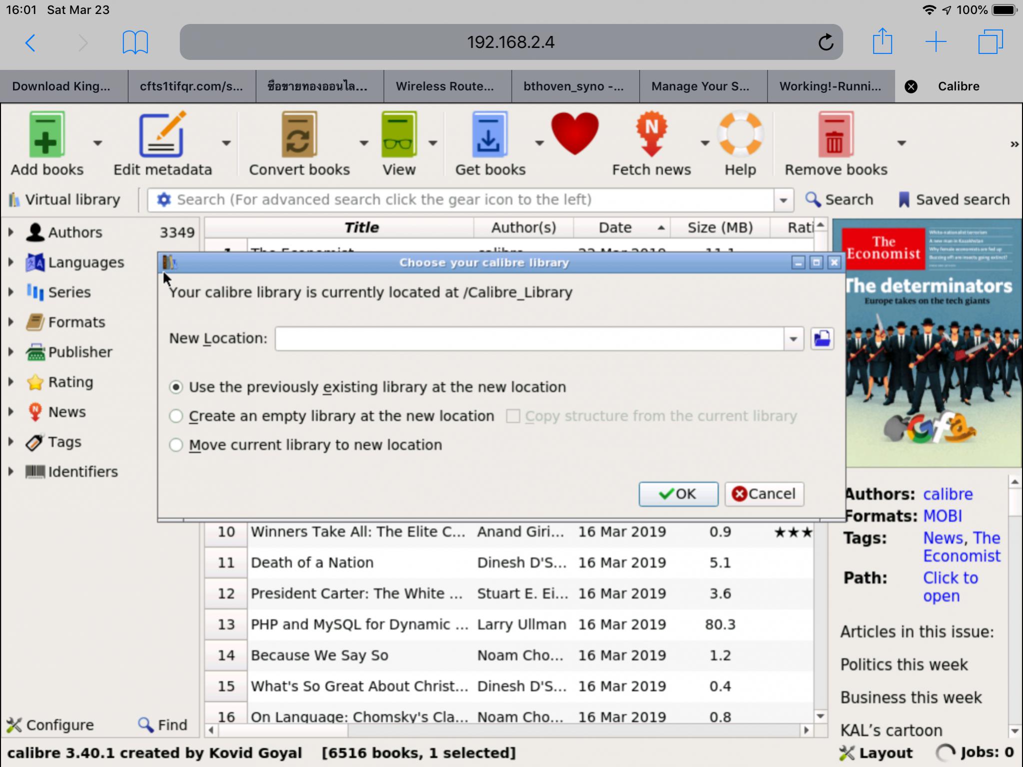 In volume mapping, you need only map the main library. Remove the config mapping, you don’t need it (assuming the config folder is in your existing /Library/Ebooks folder). If now you are running on a blank /nobody/library folder, on Calbre gui, choose Calibre Libray—>Switch library, you will see the blank folder, press up green arrow to enter the root directory.Then you will see your existing /Library folder (mapped from your /Library/Ebooks), choose it. Then you should now see all your existing ebooks catalogue. Last edited by bthoven; 03-23-2019 at 07:03 AM. |