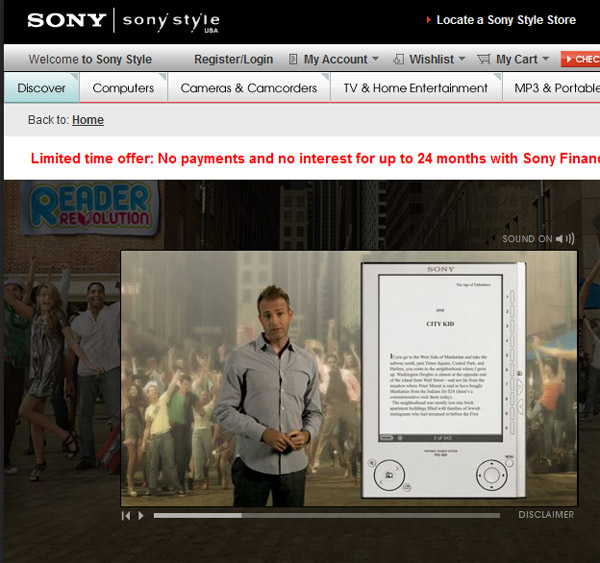 Gattcha...I will try and find a couple of them later today if I can. I am leaning more toward some shots under very bright lighting which does really improve the whiteness of the displays to my eyes. I able to take the Sony reader I looked at outside the store where there was a big difference. Still some of the shots over on the sony store do show a fairly white display. I have attached on of those shots. Still it is not perfectly white but of the display was that way all the time I would be very happy. Honestly I never looked at the Sony site before as Sony was not a reader I am interested in buying. Too many bad experiences with Sony dropping devices without notice in the past. I have Clie NX80v which works perfectly but several years ago Sony just discontinued all of their Plam OS based devices save the mylo. From looking at the Sony site their shots overall do represent what I saw in the store. |