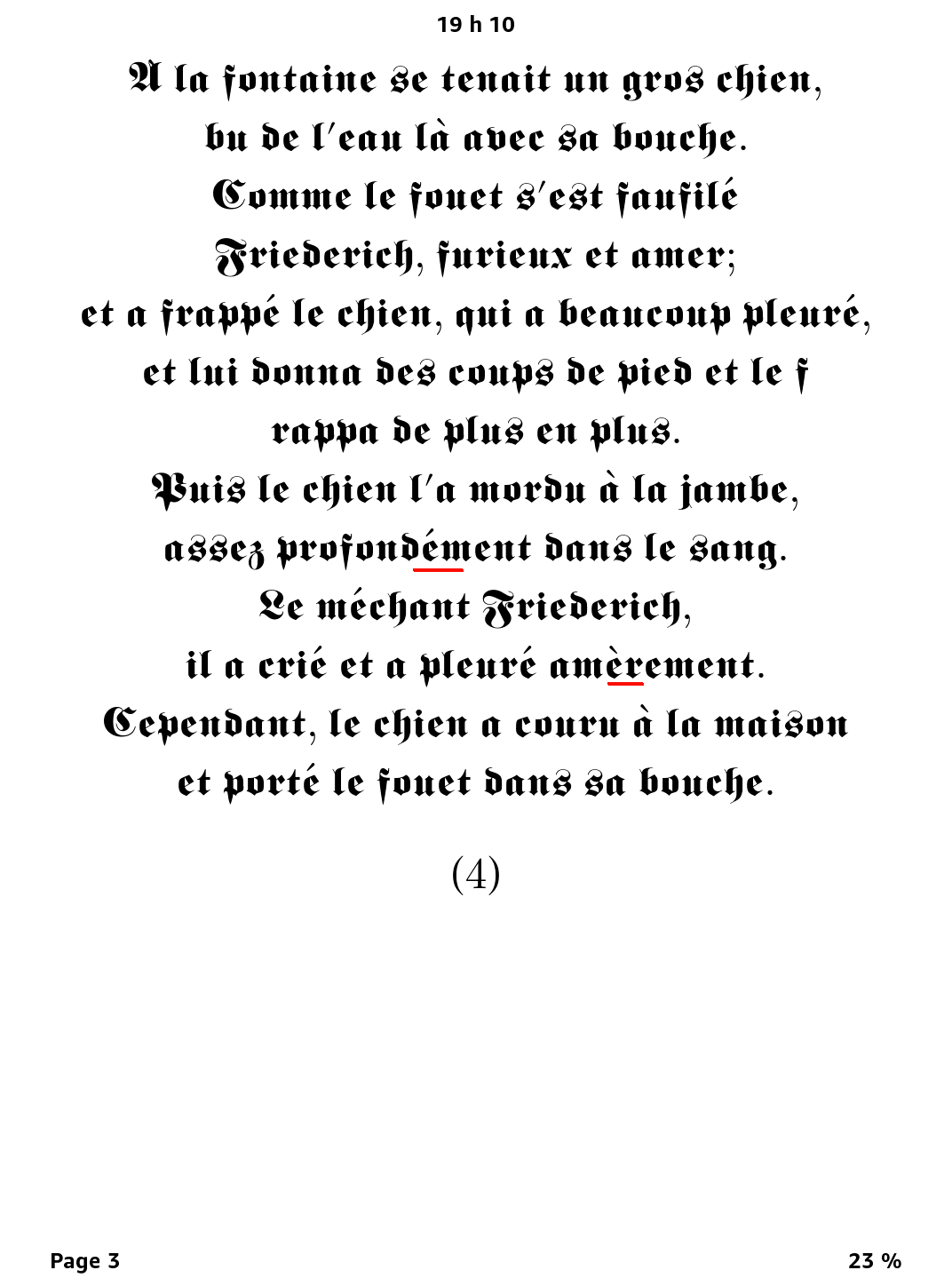 To give it a Germanized look I decided to code the text using the "Fraktur Bold" letters in the "Mathematical Alphanumeric Symbols" of the Unicode block (U+1D400..U+1D7FF) embedding a publisher font since no native font of the Kindle support this block. Not using Unicodes from the "Basic Multilingual Plane" (BMP) proved a challenge... Expectedly, this MOBI badly tricked the K3: On the PW3 the MOBI introduced unwanted blanks after accenting Fraktur letters with diacritical combining marks: But converting the MOBI to KFX perfectly fixed the rendering: Find my sources here:  |