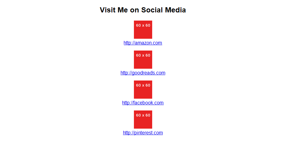 All the links work fine except I need some padding in between the images. How do add that using this code? here is the code I used <div style="text-align: center;"><a id="prime" href="http://amazon.com"><img alt="AmPrime60_107" src="../Images/AmPrime60_107.jpg"/></a> <a id="Goodread" href="http://yahoo.com"><img alt="GoodreadsIco_60_60" src="../Images/GoodreadsIco_60_60.png"/></a> <a id="Fbicon" href="http://yahoo.com"><img alt="Facebook icon_60_60" src="../Images/Facebook%20icon_60_60.png"/></a> <a id="pinterest" href="http://pinterest.com"><img alt="pinterest_60_60" src="../Images/pinterest_60_60.png"/></a> |