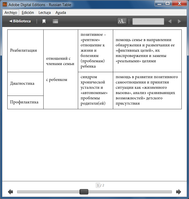 Yes of course! For example, here is a large table. In the mobile application, it is poorly displayed. <table class="tablemobile"> <caption>Компоненты и проблемы поддержки детей с ОВЗ и их семей</caption> <tbody> <tr> <td class="center"> <strong>Компоненты </strong> </td> <td class="center"> <strong>Проблемы </strong> </td> <td class="center"> <strong>Фокусы</strong> </td> <td class="center"> <strong>Техники поддержки</strong> </td> </tr> <tr> <td> Диагностика </td> <td rowspan="3"> отношений с собой <br/><br/><br/>с миром </td> <td> пассивное отношение семьи к жизни и к проблемам (болезни) ребенка </td> <td> развенчание иллюзий «нормальности» нарушений в отношениях, поведении и переживаниях ребенка и других членов семьи в противовес необходимости постоянной заботы о ее развитии, активных и комплексных, постоянных действий и усилий </td> </tr> <tr> <td> Коррекция </td> <td rowspan="2"> негативное отношение к жизни, в том числе депрессивные установки и состояния </td> <td rowspan="2"> использование техники процедур переформулирования (позитивное переосмысление и т. д.), преодоления логических искажений (сверхобобщения, катастрофизации или преуменьшения значимости) в базисных посылках (стереотипах осмысления своей жизни) родителей и детей </td> </tr> <tr> <td> Мониторинг </td> </tr> <tr> <td> Реабилитация </td> <td rowspan="3"> отношений с членами семьи <br/><br/><br/>с ребенком </td> <td> позитивное – «рентное» отношение к жизни и болезням (проблемам) ребенка </td> <td> помощь семье в направлении обнаружения и развенчания ее «фиктивных целей», их ниспровержения и замены «реальными» целями </td> </tr> <tr> <td> Диагностика </td> <td rowspan="2"> синдром хронической усталости и «автономные» проблемы родителя(ей) </td> <td rowspan="2"> помощь в развитии позитивного самоотношения и принятия ситуации как «жизненного вызова», анализ «развивающих возможностей» детского присутствия </td> </tr> <tr> <td> Профилактика </td> </tr> <tr> <td> Развитие </td> <td rowspan="2"> отношений с родительской семьей со специалистами </td> <td> осмысление болезней и иных проблем в развитии и отношениях ребенка как «наказания», чувство вины </td> <td> помощь в разработке представлений о вине в направлении поиска иррациональных предубеждений, психогенетический анализ, психодраматические розыгрыши и «семейные расстановки», «целеориентированная» трансформация проблемных ситуаций </td> </tr> <tr> <td> Сопровождение и реабилитация </td> <td> проблемы частичного принятия ребенка и чувства вины по поводу непринятия ребенка </td> <td> «терапия реальностью», помощь в осмыслении невозможности полного принятия, а также позитивных функций непринятия в развитии ребенка и семьи </td> </tr> </tbody> </table> |
