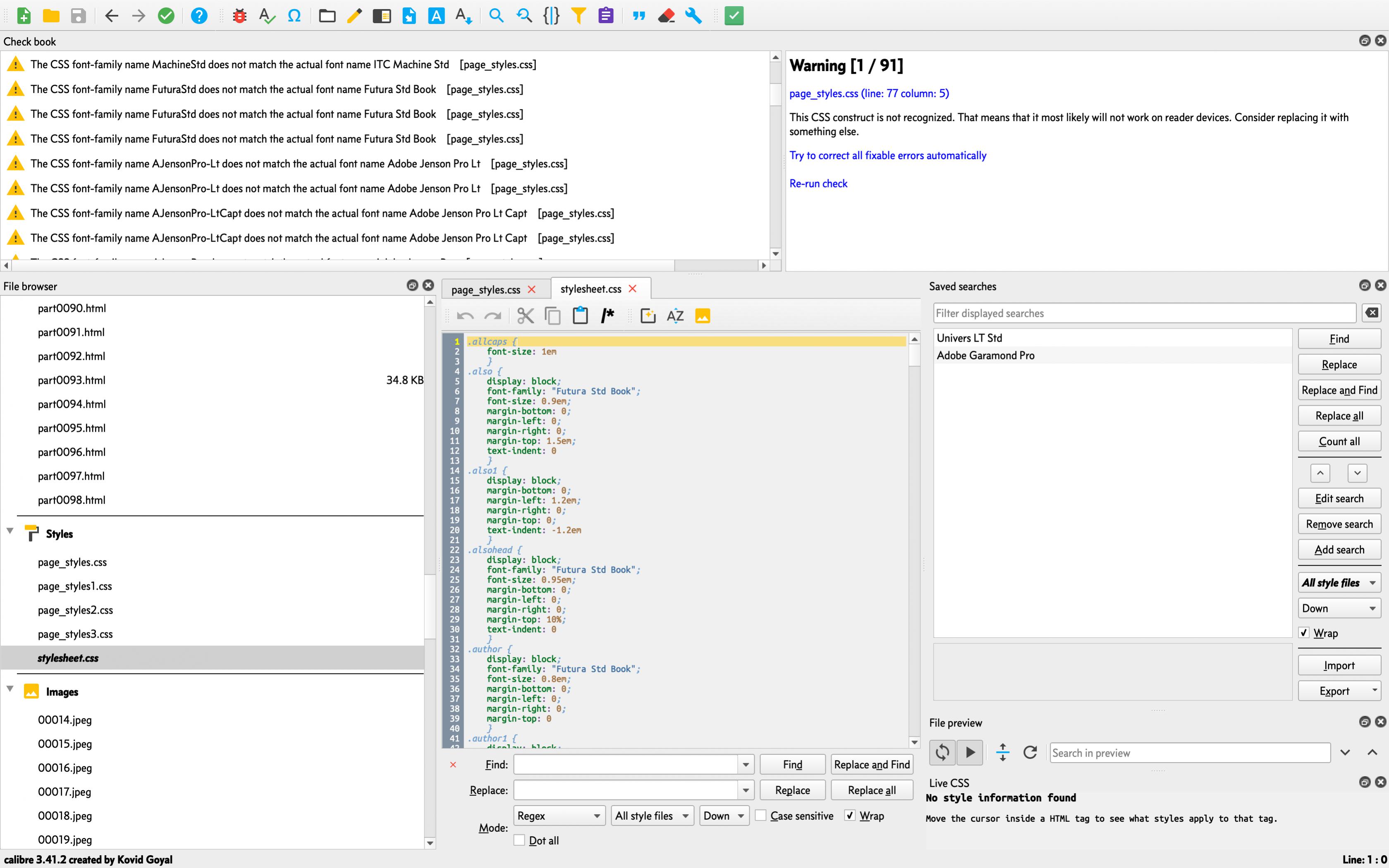 I thought that the transform styling tool should work for that purpose. But when it didn't work, I thought perhaps @font-face rules were deliberately excluded for some (technical?) reason. So, it seems this may just be a bug in the conversion process when Calibre applies the transform rules. Here is a screenshot of some of the transform rules that I've set up: Here are a couple screenshots of the original eBook CSS before conversion: Then after conversion, here are a couple of screenshots. You can see that the @font-face rules were not transformed. I would like to embed the fonts in all of my EPUBs if they aren't included already. Although I realize this increases the size of the books, I would like to view the books as they were intended by the author/publisher. I'm not a font expert, but as I understand it, the problem with the embedding process is due to how different platforms (macOS, Windows, Linux) refer to the fonts and also differences between identification of .TTF and .OTF versions of the same font across the platforms. In the CSS, the font may be listed as "AJensonPro-Lt" (from Windows?), but macOS sees it as "Adobe Jenson Pro Lt". So, when Calibre tries to embed the font, it doesn't see the font from macOS as it is listed in the CSS. I realize that this may be a big undertaking, but font substitution would be a cool feature to add. That way, the user could set up the fonts to substitute, not only for editing, but also for previews and the E-Book Viewer. I wish the OSs would support font substitution natively and allow users to tweak them. Let me know your thoughts.. Thank you in advance! Jonathan Last edited by JonnieCache; 04-21-2019 at 04:21 PM. |