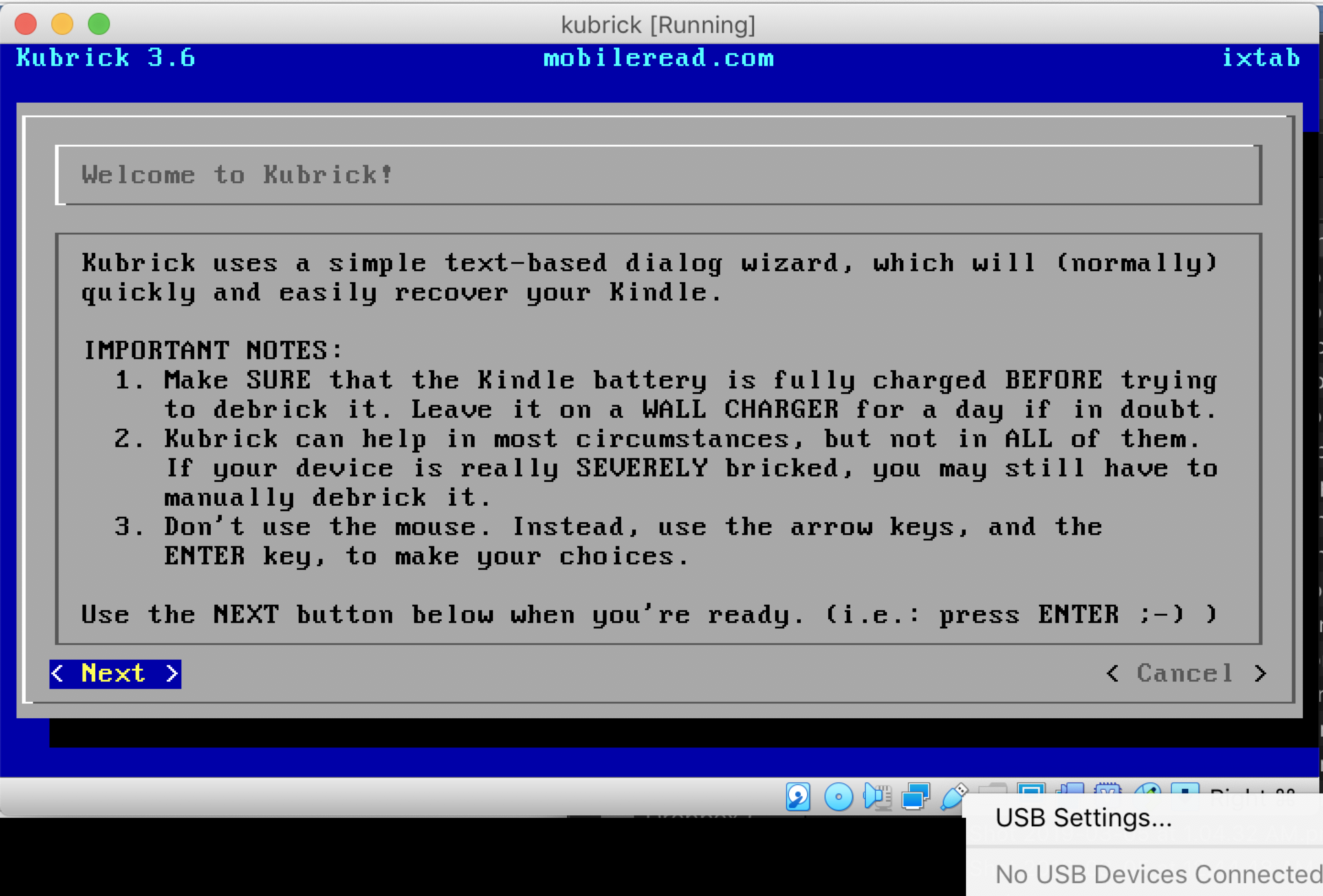 BUT when I used the Kubrick ISO in a vm ,it was stuck in the step"Press NEXT once your kindle is in Fastboot mode".